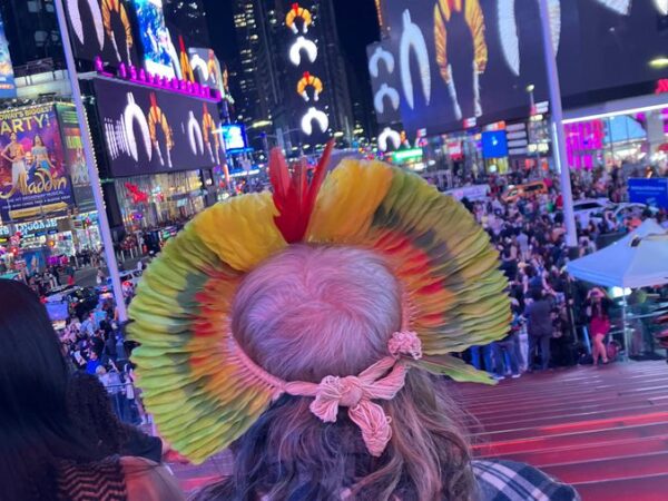 Cacique Raoni assiste dominação dos telões da Times Square em campanha All Amazonia do BB. Foto: Beptuk Hokrit Metuktire/Instituto Raoni