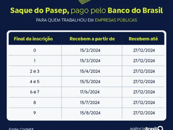O PIS é pago pela Caixa Econômica Federal; e o Pasep, pelo Banco do Brasil. Como ocorre tradicionalmente, os pagamentos serão divididos em seis lotes, baseados no mês de nascimento, no caso do PIS, e no número final de inscrição, no caso do Pasep. O saque iniciará nas datas de liberação dos lotes e acabarão em 27 de dezembro de 2024. Após esse prazo, será necessário aguardar convocação especial do Ministério do Trabalho e Previdência.