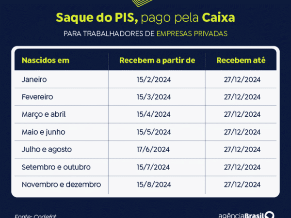 Ao todo, a Caixa Econômica Federal liberará R$ 1,9 bilhão neste mês. Aprovado no fim do ano passado, o calendário de liberações segue o mês de nascimento do trabalhador, no caso do PIS, ou o número final de inscrição do Pasep <https://agenciabrasil.ebc.com.br/economia/noticia/2023-12/pispasep-2024-comeca-ser-pago-em-15-de-fevereiro>. Os pagamentos ocorrem de 15 de fevereiro a 15 de agosto.