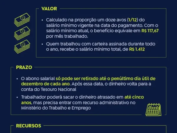 O valor do abono é proporcional ao período em que o empregado trabalhou com carteira assinada em 2022. Cada mês trabalhado equivale a um benefício de R$ 117,67, com períodos iguais ou superiores a 15 dias contados como mês cheio. Quem trabalhou 12 meses com carteira assinada receberá o salário mínimo cheio, de R$ 1.412.