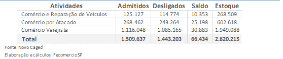 Na visão da FecomercioSP, como a geração de emprego está condicionada às condições financeiras e de confiança dos empresários, o ritmo do indicador acompanhou as tendências de um ano de avanço nas dificuldades conjunturais, como juros elevado e altos índices de endividamento e inadimplência de pessoas físicas e jurídicas. Esses fatores — e até mesmo o direcionamento de renda a alguns segmentos dos Serviços — causaram um impacto maior ao Comércio.