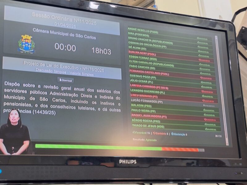 Na tarde desta terça-feira, 1º de abril, a Câmara Municipal de São Carlos aprovou, com 15 votos a favor e 5 contrários, o projeto de reajuste salarial proposto pela Prefeitura, que beneficia os servidores municipais concursados, ativos e inativos. O aumento, de 6,56%, foi apresentado pela prefeitura ao Sindicato dos Servidores Públicos e Autárquicos Municipais (SINDSPAM), em uma reunião no Paço Municipal, sendo rejeitado pelos servidores em duas assembleias.